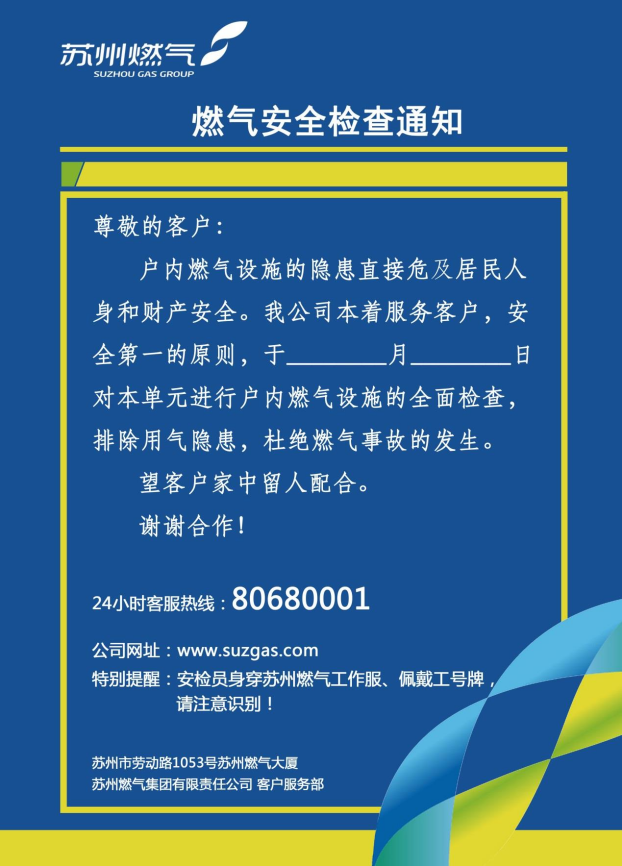 苏州燃气的工作人员都统一穿戴蓝色工作服、带工作证、提工作包;包括放工具的小垫子上都印有苏州燃气的醒目标志。工作人员在向用户介绍自己的身份,展示自己工作证后,征得用户的允许在穿好鞋套后进入室内进行燃气安全检查。在工作期间,安检员会逐一检查燃气管道,排查是否存在安全隐患,并填写安检单。安检员不仅要对用户燃气设施的使用环境进行检测,也要对用户进行用气知识进行宣传,安全用气须知会发放给每一个燃气用户。我们的安检单以及宣传资料上都印有80680001的服务热线电话,用户如有疑虑也可拨打热线电话进行辨别。
