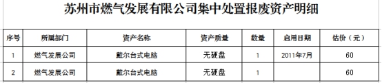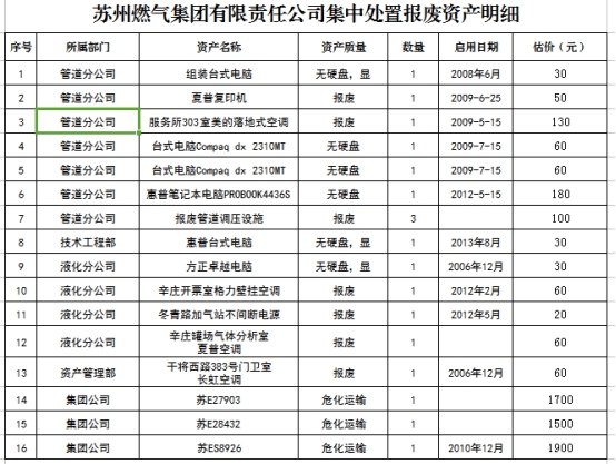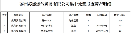 公司及其所属苏州市燃气发展公司、苏州苏燃燃气贸易有限公司一批报废资产作拍卖处理,现将拍卖公司评估价格及资产信息公示如下: