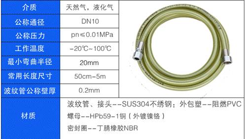 燃气灶具专用不锈钢波纹连接管选用304不锈钢制成,特别应用于固定式燃气具的管路连接,经专用设备和特殊工艺加工而成,它具有外形美观、防鼠咬、耐腐蚀、弯曲最小角度不阻气、可任意挠曲、密封性能好、使用安全、拆装方便、管体寿命最长可达10年等优点。是取代传统橡胶燃气管的更新换代产品。